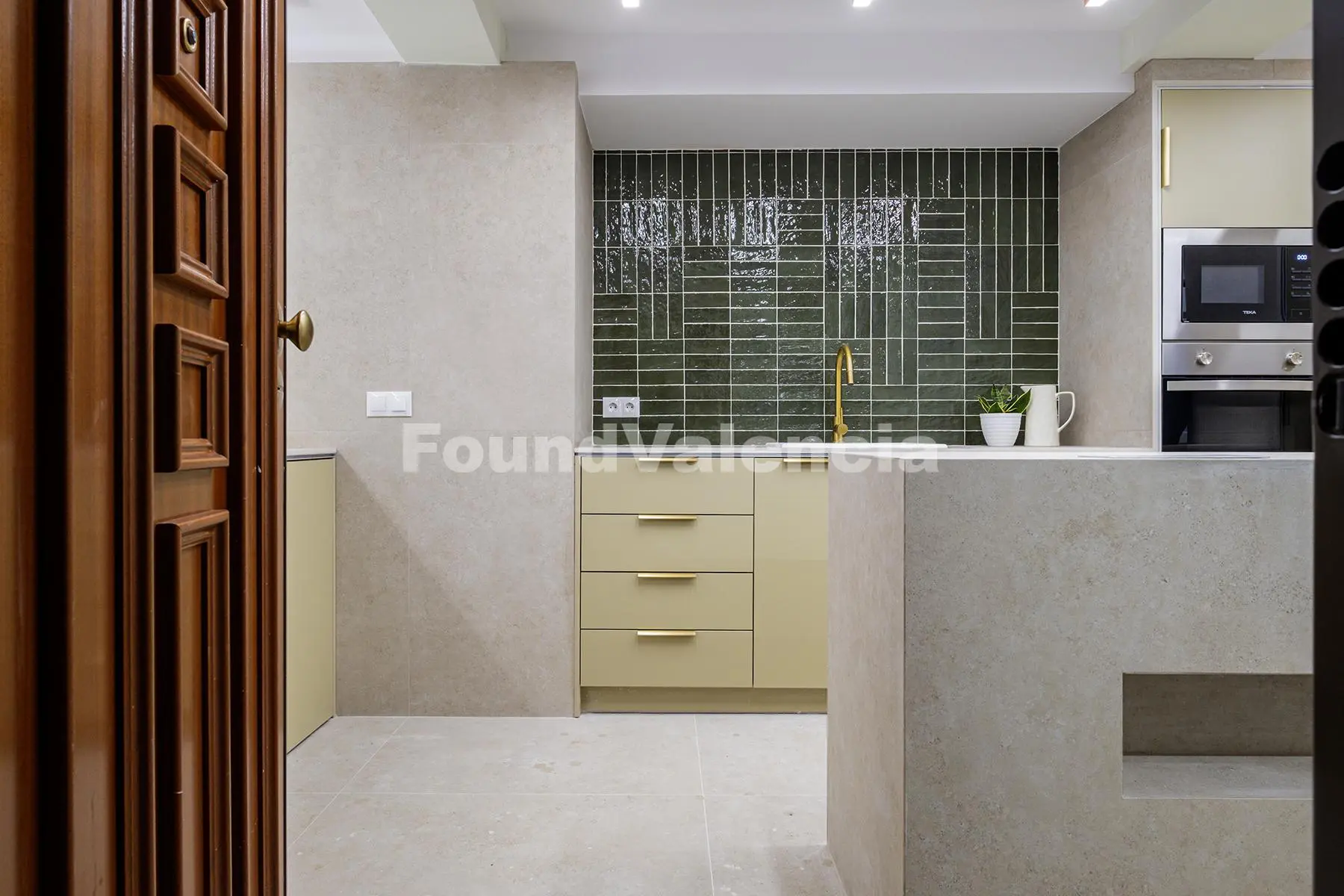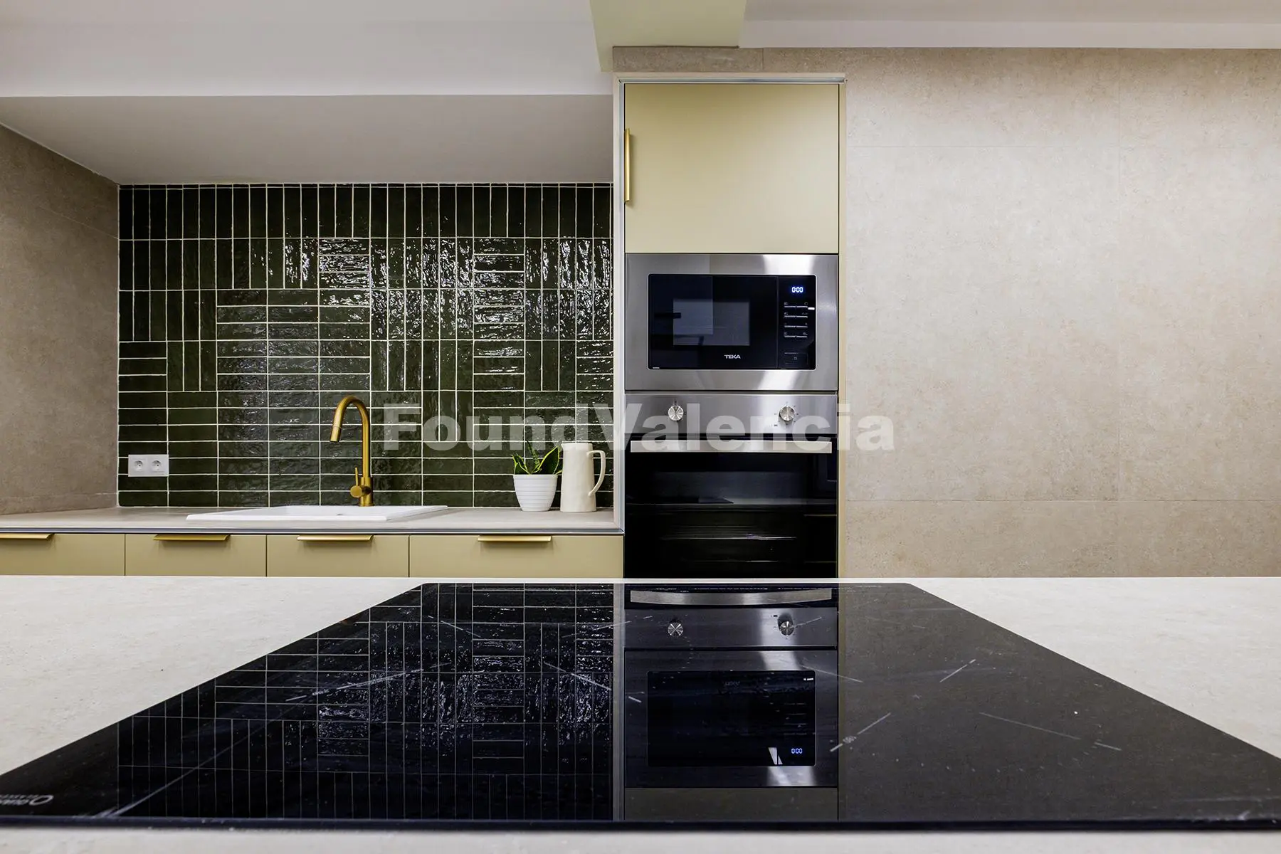 The property is laid out with three double bedrooms, all with built-in wardrobes, and two complete bathrooms, one of them en suite. It features a bright living-dining room and a modern, fully equipped kitchen with integrated dishwasher, refrigerator, oven, microwave, induction hob and recirculating extractor hood with carbon filters, as well as a designated space for a washing machine.